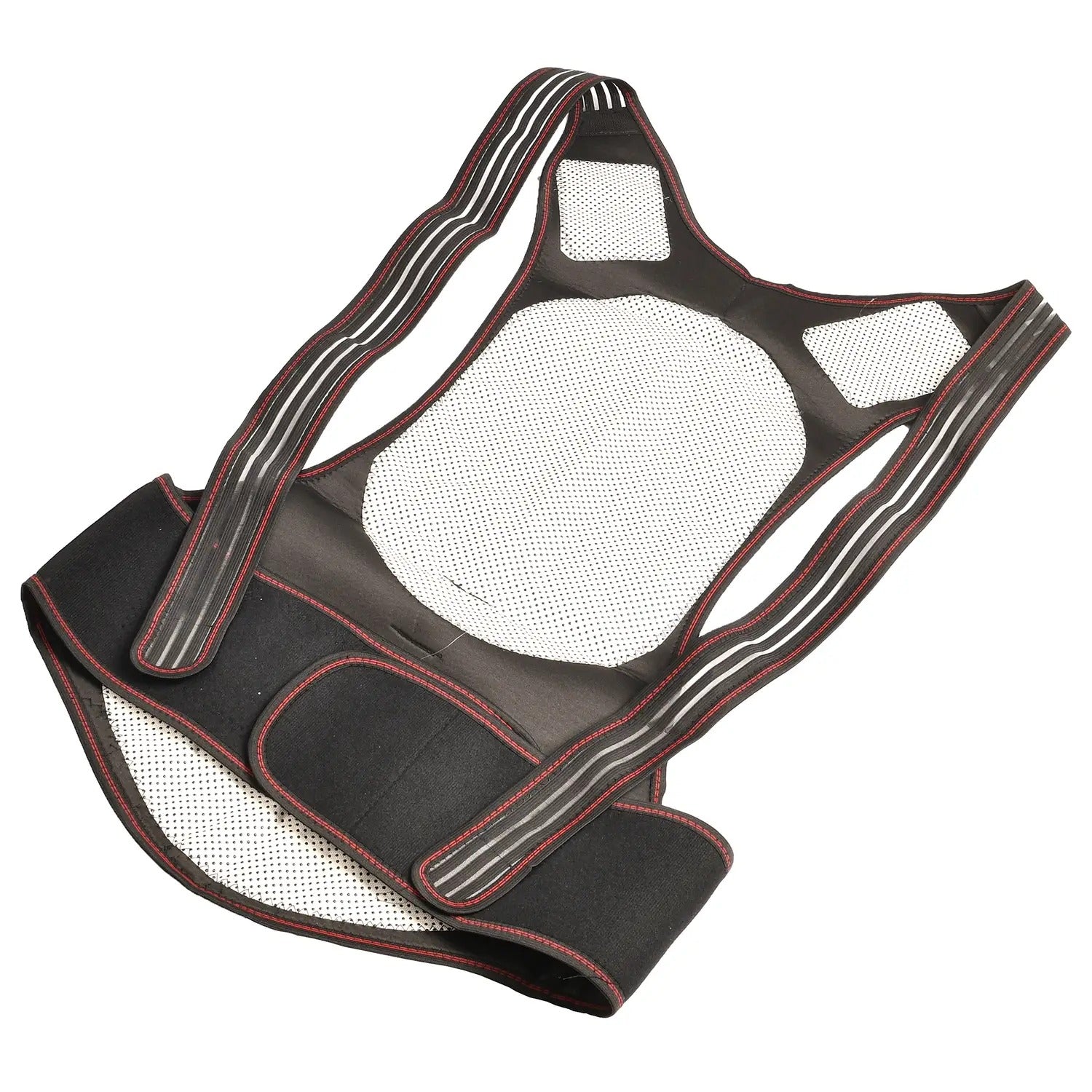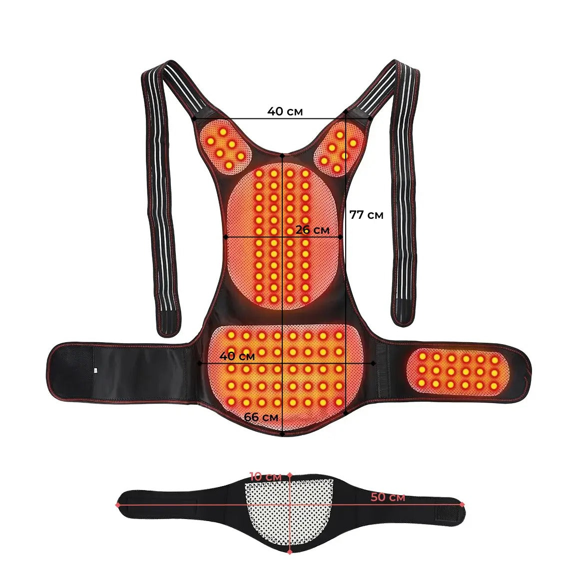 | Rozměry (délka x šířka x výška) | Korzet – 77×40 cm; Dolní stabilizační pásy – 35×14 cm (neroztažitelné), celková délka – 120 cm; Horní stabilizační pásy – 76×5,5 cm, každý se natahuje až na 140 cm; Plastové vložky – 17×17 cm, 11×2 cm, tloušťka 2 mm; Pásek na krk (s 5 magnety) – 50×10 cm |