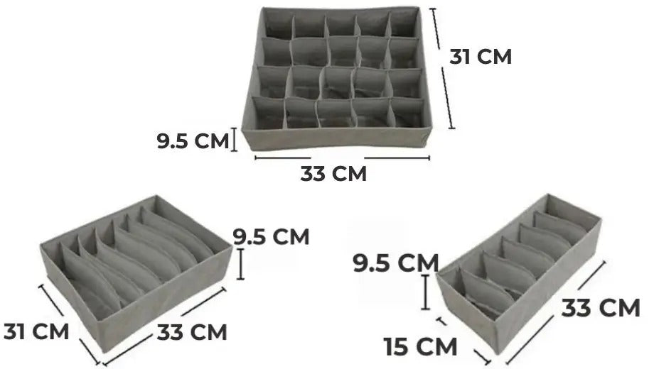 Vneste do svého šatníku harmonii s našimi elegantními organizéry na spodní prádlo! Tato sada se skládá ze tří praktických organizérů, které vám umožní přehledně uložit vaše věci a maximalizovat prostor ve vaší skříni. Díky jejich promyšlenému designu je můžete snadno umístit i na malé police nebo je stohovat, takže mnohem snáze najdete potřebné položky.