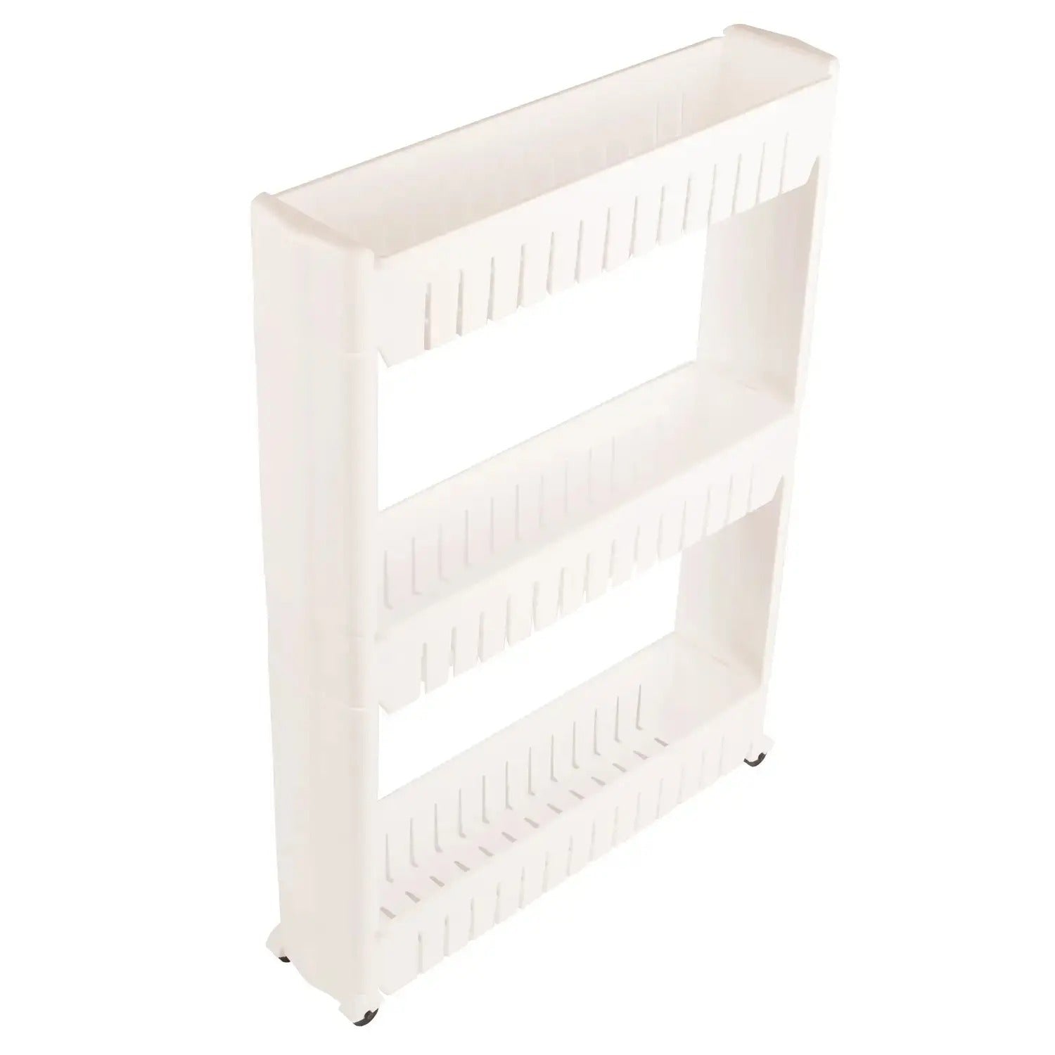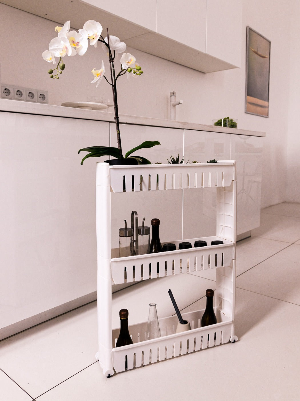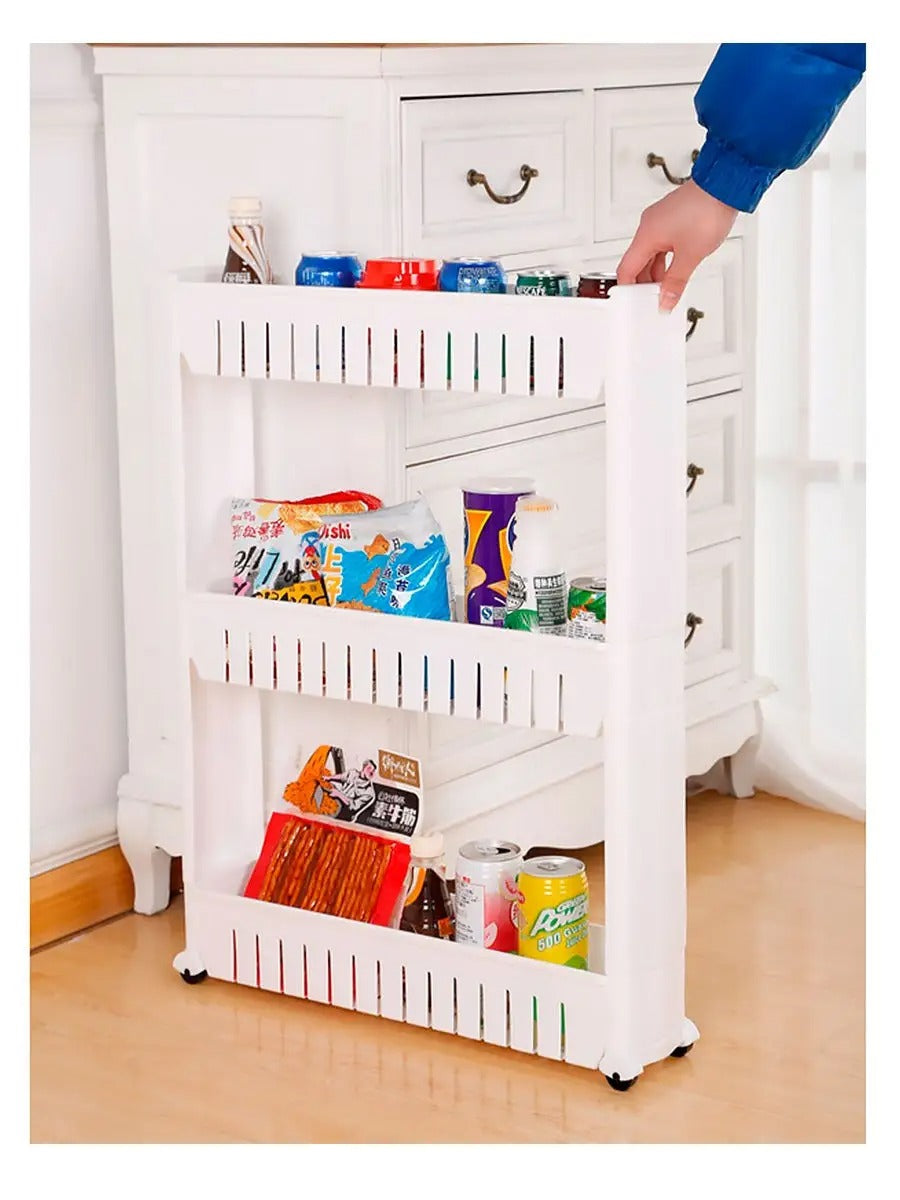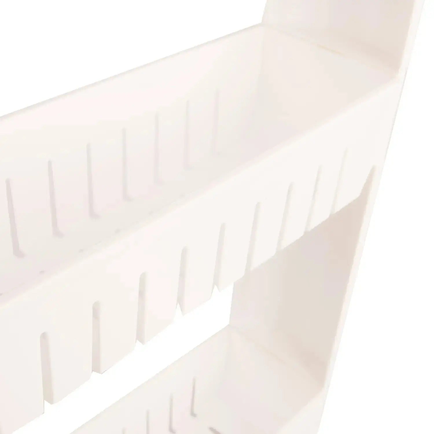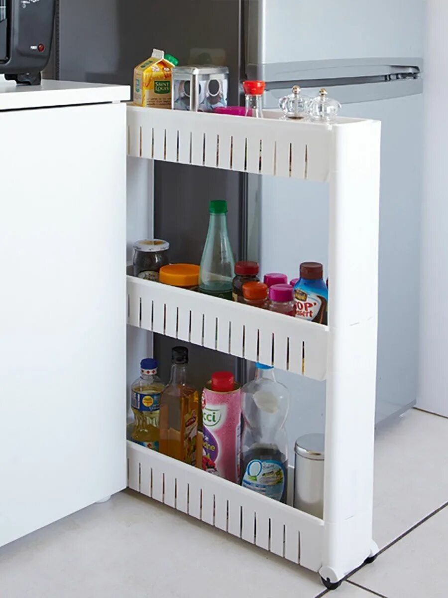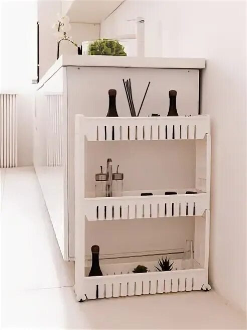 Polička má tři úrovně, z nichž každá má boční stěny. Díky tomu můžete různé předměty uspořádat kompaktně a bezpečně přesouvat polici, aniž byste se museli obávat, že spadnou.
