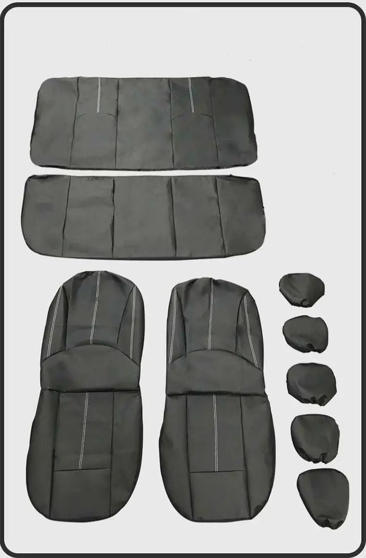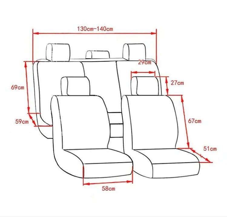 | Rozměry (D x Š x V) | Potahy zadních sedadel: 130-140x128 cm Potahy předních sedadel: 118x58 cm Potahy opěrek hlavy: 29x27 cm |