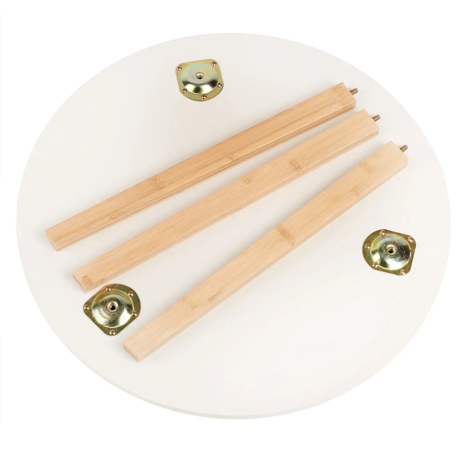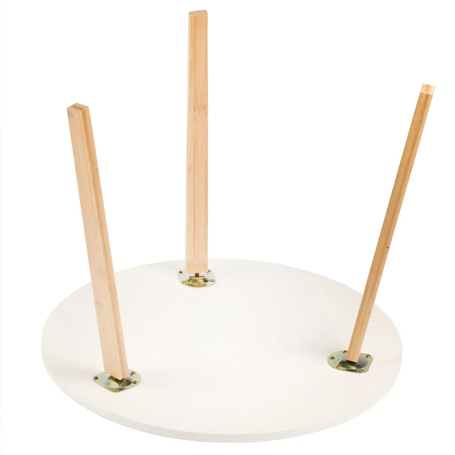 Stolek je vyroben z přírodního bambusu – materiálu známého svou trvanlivostí, odolností proti vlhkosti a ekologickými vlastnostmi. Tři stabilní nohy zajišťují pevnost konstrukce, a hladká MDF deska je odolná proti poškrábání a snadno se čistí.