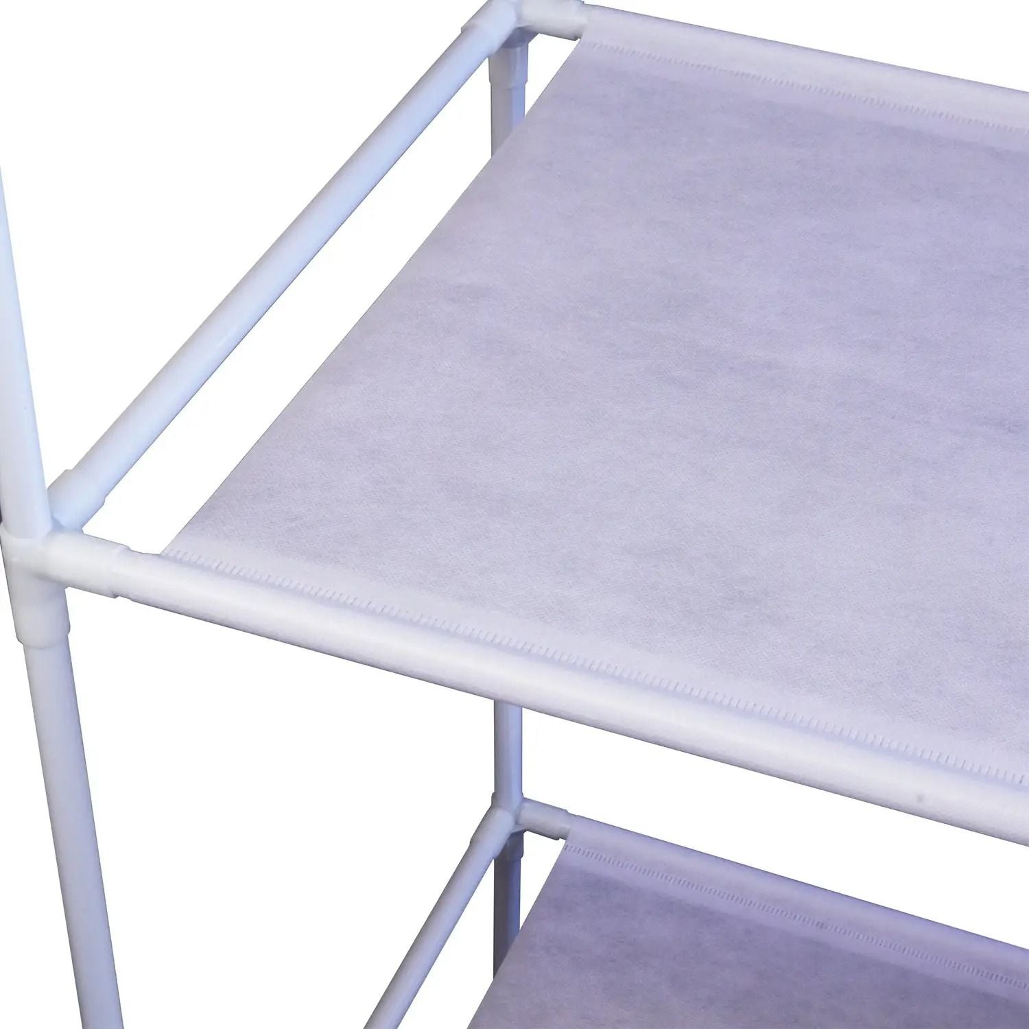 Věšák je vybaven 6 širokými policemi, na které můžete umístit boty, tašky, skládané lůžkoviny a mnoho dalších věcí. Police jsou vyrobeny z voděodolné tkaniny natažené přes kovové trubky, což zajišťuje odolnost a snadné čištění.